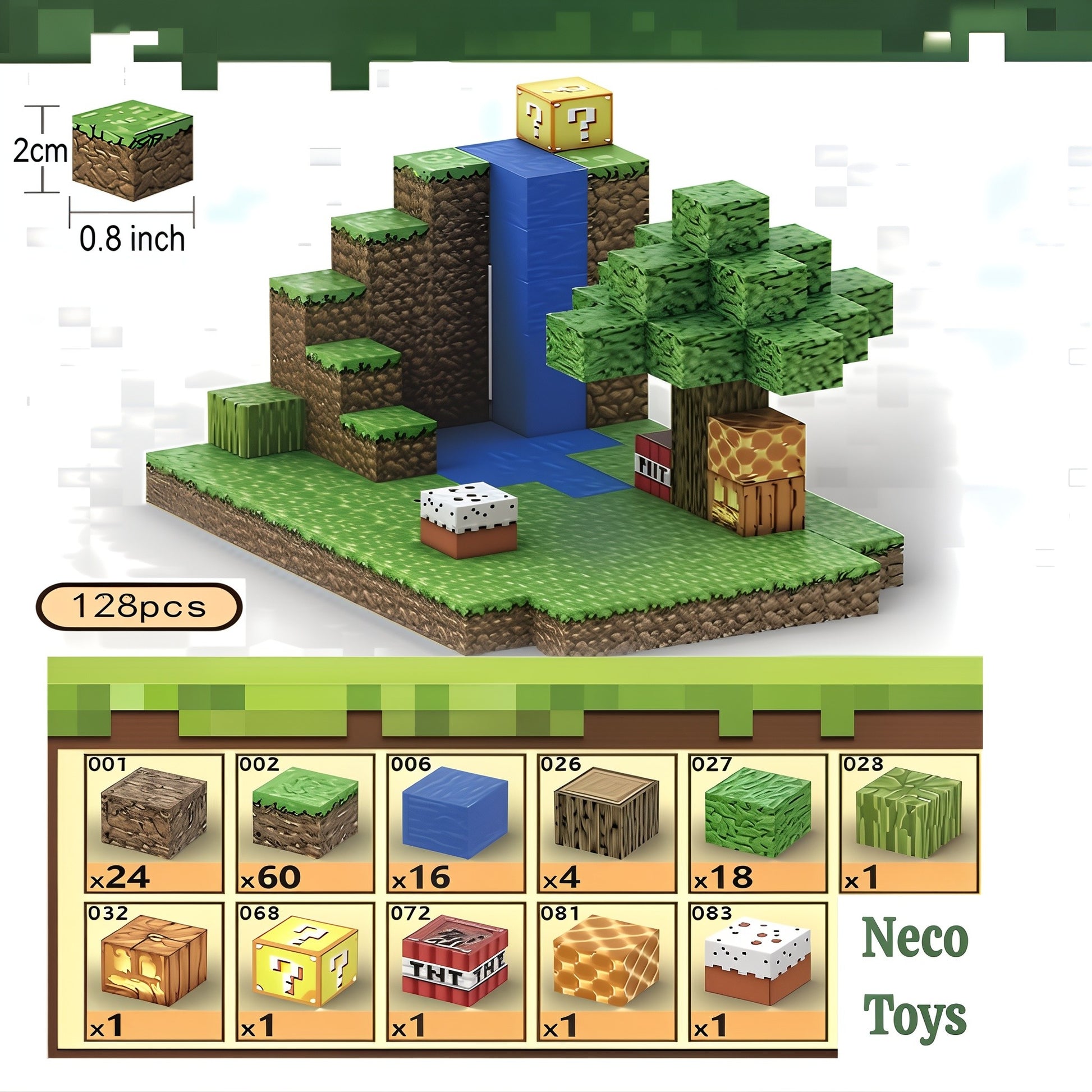 Box contents: 128 magnetic blocks, instruction manual, storage bag.